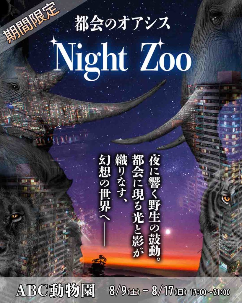「多重露光効果」バナー 2025年7月25日 最終更新日時 : 2025年12月22日 MW Adobeクリエイティブカレッジ「お題にチャレンジ!」複数の写真を1枚に重ねて表現する「多重露光効果」。動物が大好きなので、自然×人工物を意識し、動物を入れた Night Zoo(都会の動物園)バナーを制作してみました。(自主制作)